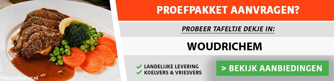 In deze streek zijn o.a. de volgende aanbieders werkzaam: Apetito, Maaltijdservice.nl, Vers Aan Tafel, Diepvriesman, Kantenklaarmaaltijden.nl, Uitgekookt. Deze kant-en-klaar maaltijden moet u nog wel even opwarmen. Warme maaltijdbezorging in Woudrichem wordt doorgaans gedaan door zorggroepen en organisaties voor maatschappelijk werk in Woudrichem.