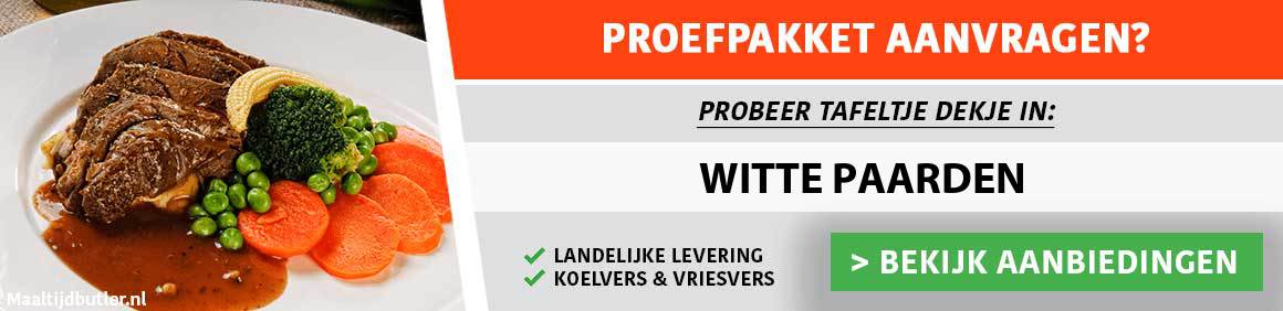 In deze streek bezorgen onder andere Uitgekookt, Vers Aan Tafel, Maaltijdservice.nl, Apetito, Mealhero, Diepvriesman. Deze kant-en-klaar maaltijden kunt u verwarmen en eten wanneer u dat wilt. Warme maaltijdbezorging in Witte Paarden ligt vaak meer in handen van zorggroepen en organisaties voor maatschappelijk werk in Witte Paarden.